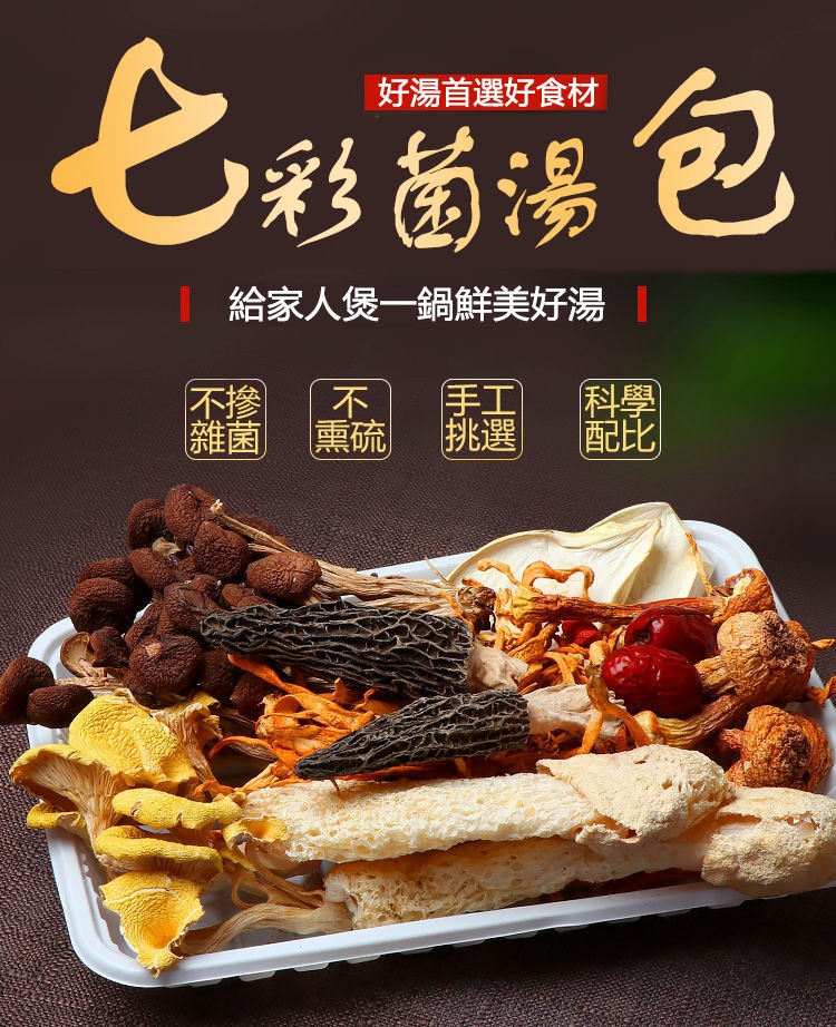 7分鐘前七彩菌湯包,鮮香濃郁,菌體肥嫩,當季乾貨,自然曬乾無硫熏,煲湯首選! - 自然無硫熏,無添加食用更安心! [秋冬 季節必備的七彩野生菌湯包x10=NT$1150 ]